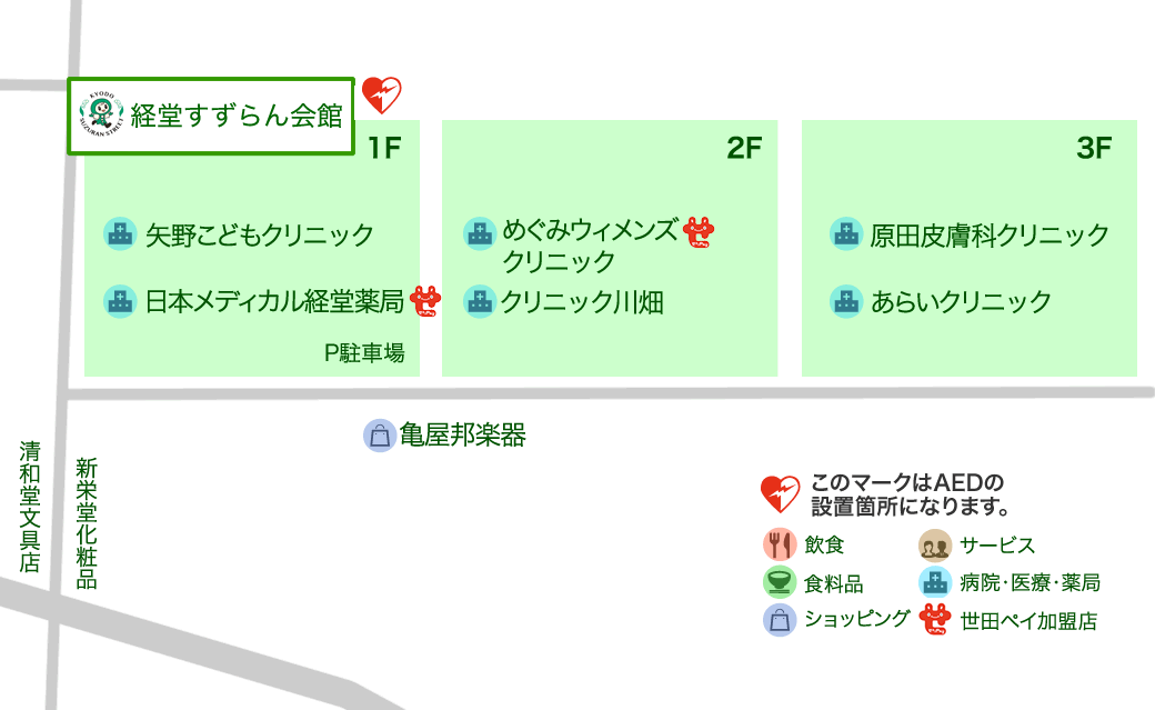めぐみウィメンズ クリニック 亀屋邦楽器 原田皮膚科クリニック あらいクリニック クリニック川畑 日本メディカル経堂薬局 矢野こどもクリニック